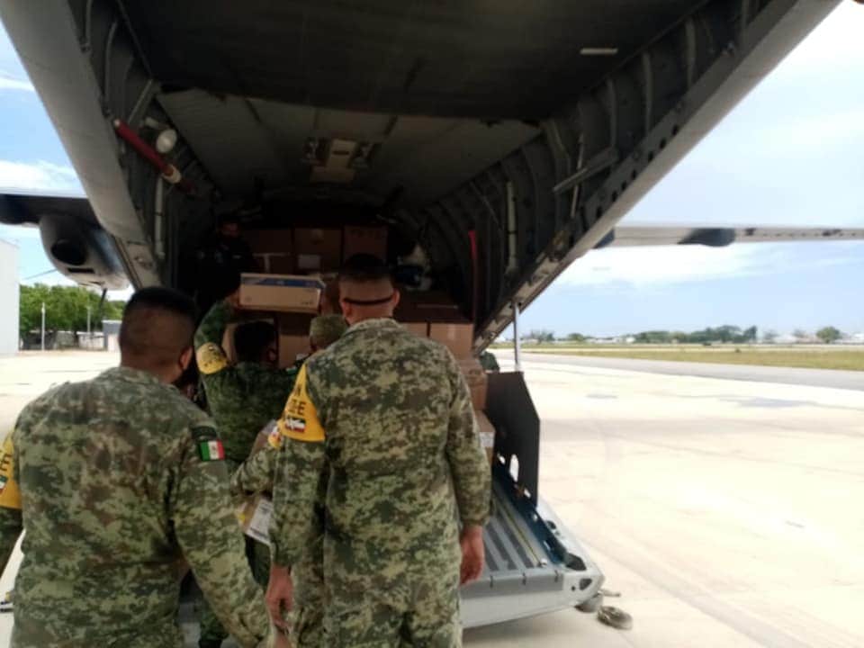 Asimismo, se indicó que el material recibido será distribuido por personal militar de este Mando Territorial en los Hospitales Insabi COVID-19 de las ciudades de Chetumal, Cancún y Tulum.