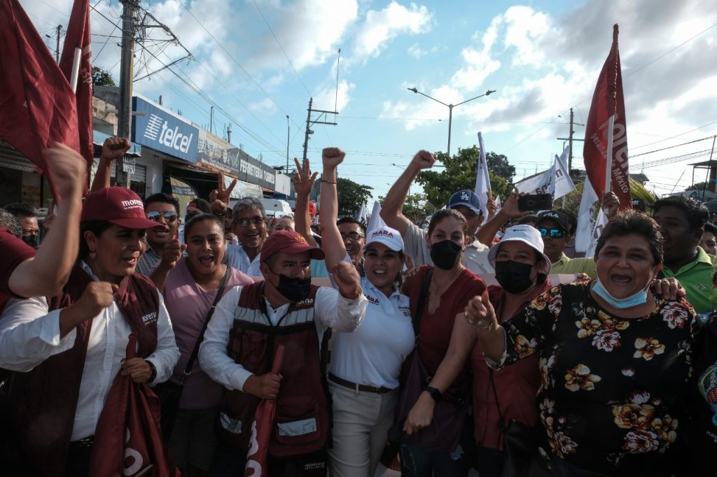 En la primera caminata, en la calle Brasil, de la avenida Xel-Há a la calle Bolivia, la abanderada del Movimiento de Regeneración Nacional (Morena) y de los partidos Verde Ecologista de México (PVEM), del Trabajo (PT) y Fuerza por México (FxM), cuyos dirigentes estatales, como todos los días, estuvieron a su lado, fue recibida con un mensaje contundente: “La Guadalupana confía en ti”.