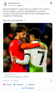 Poder y Crítica | Redacción | Tom Lockyer, capitán del Luton, salió del hospital en el que fue ingresado tras sufrir un paro cardiaco en pleno partido el pasado 16 de diciembre, anunció el club de la Premier League, sin dar detalles sobre el futuro de la carrera del futbolista.