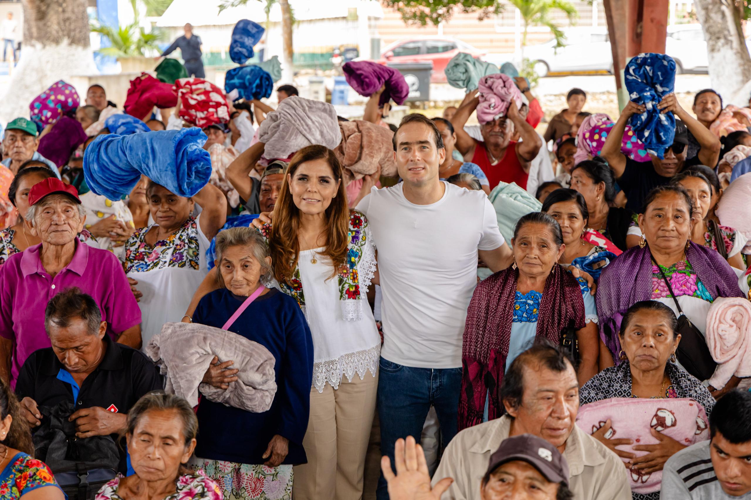 Acompañada por el presidente municipal de Tulum, Diego Castañón, la presidenta hizo entrega de estos cobertores y cobijas en el domo principal de la comunidad de Chanchen Primero en coordinación con el Sistema municipal DIF de Tulum.