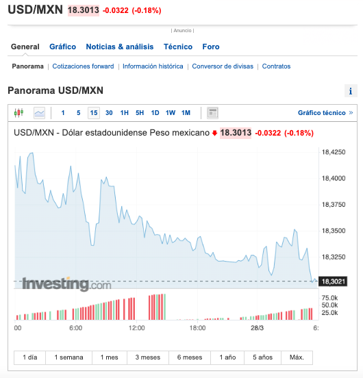 De acuerdo con información de Reuters, el lunes 27 de marzo el peso mexicano cotizaba en 18.3307 por dólar casi al final de los negocios, con una apreciación del 0.45%, ligando así su tercera jornada consecutiva de ganancias.
