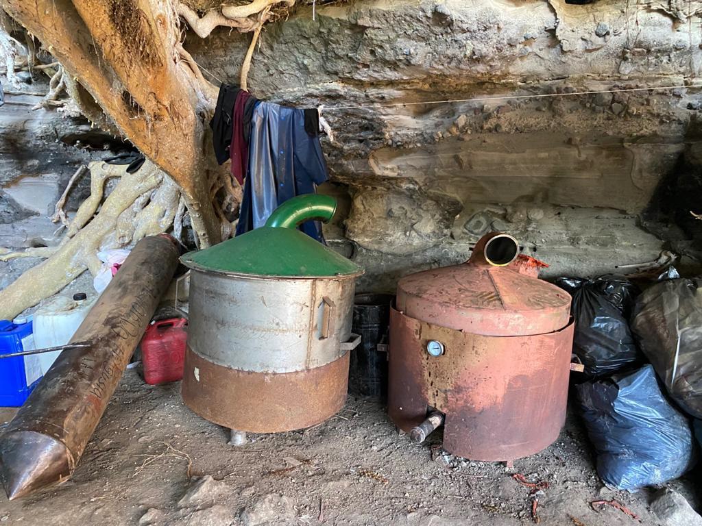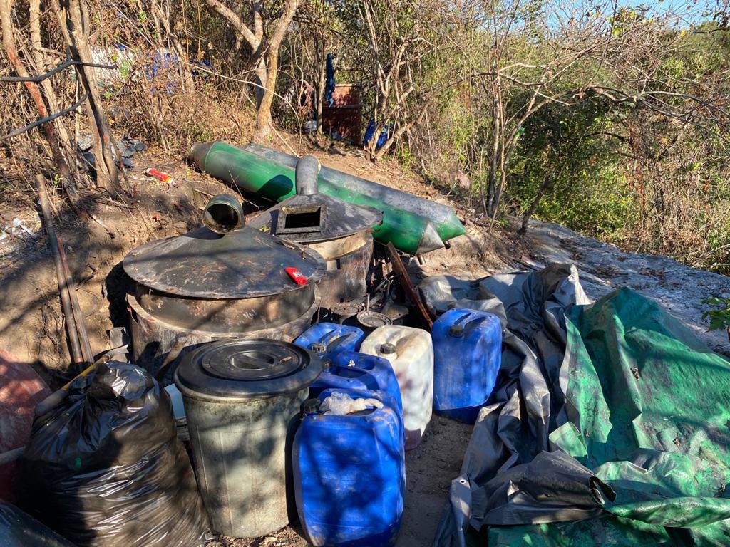 Los hechos ocurrieron cuando personal militar jurisdiccionado a la 21/a. Zona Militar y de la Guardia Nacional, al efectuar recorridos terrestres a inmediaciones del poblado “La Higuera”, municipio de Peribán de Ramos, Mich., localizó un laboratorio en el que se elaboraban presuntas drogas sintéticas; asimismo, se aseguró lo siguiente: