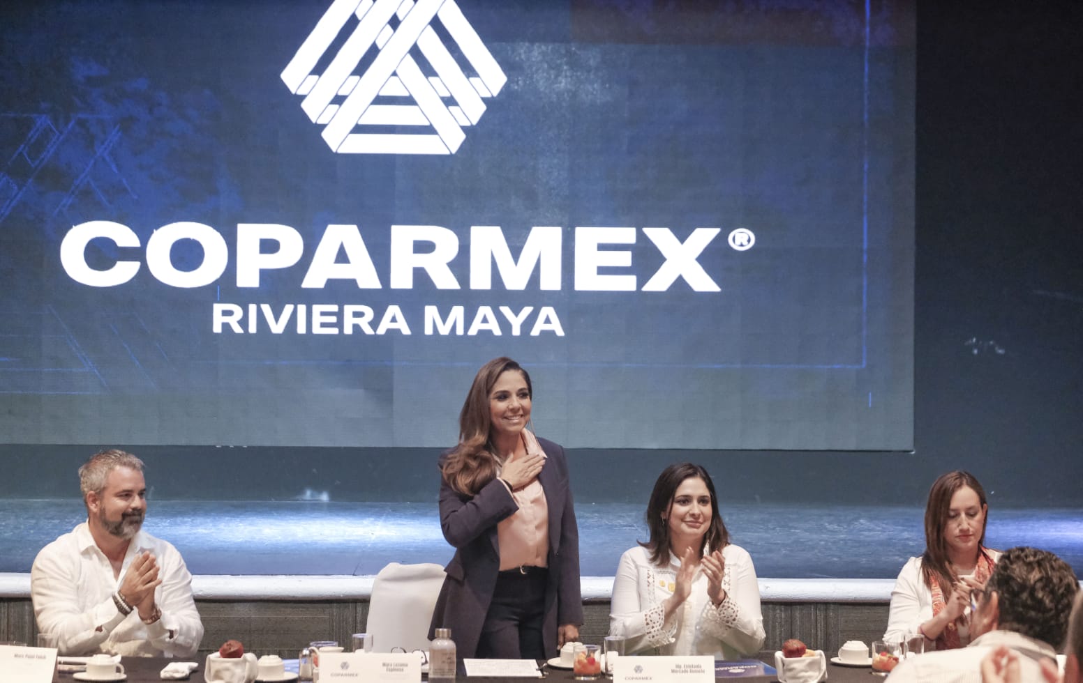 La bienvenida a este encuentro la dio Mark Pujol Folch, presidente de la Coparmex Riviera Maya y acompañaron a la Gobernadora en el presídium la diputada Estefanía Mercado Asencio, presidenta de la Comisión de Planeación y Desarrollo Económico del Congreso de Quintana Roo; Angélica Frías González, Presidenta de Coparmex Quintana Roo; Willma Padilla Barbosa, presidenta Coparmex Cozumel; Raúl Eliu Villanueva Argüelles, presidente Coparmex Chetumal, y Perla Aguilar, subsecretaría de Desarrollo Económico.