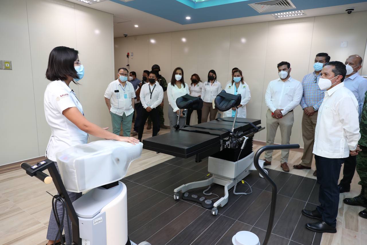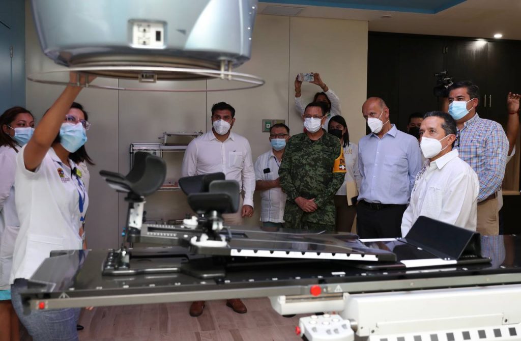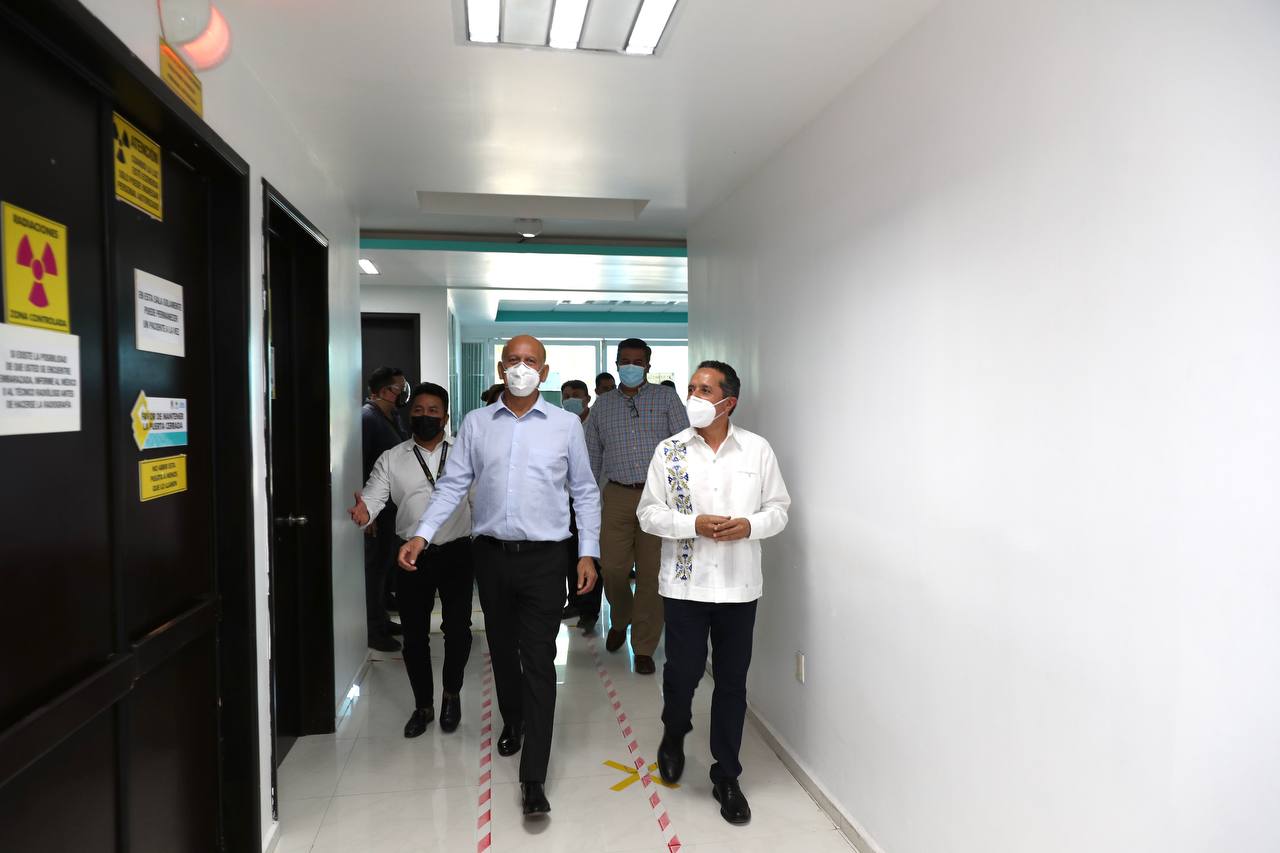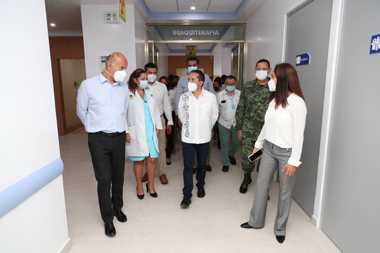 El titular del Ejecutivo estatal y el director general del INSABI recorrieron las áreas de tomografía, acelerador lineal y braquiterapia del Hospital Oncológico de Chetumal, donde la directora Liliana López y la jefa del Área de Radioterapia Marlene Dávalos Olvera explicaron el funcionamiento de las mismas.