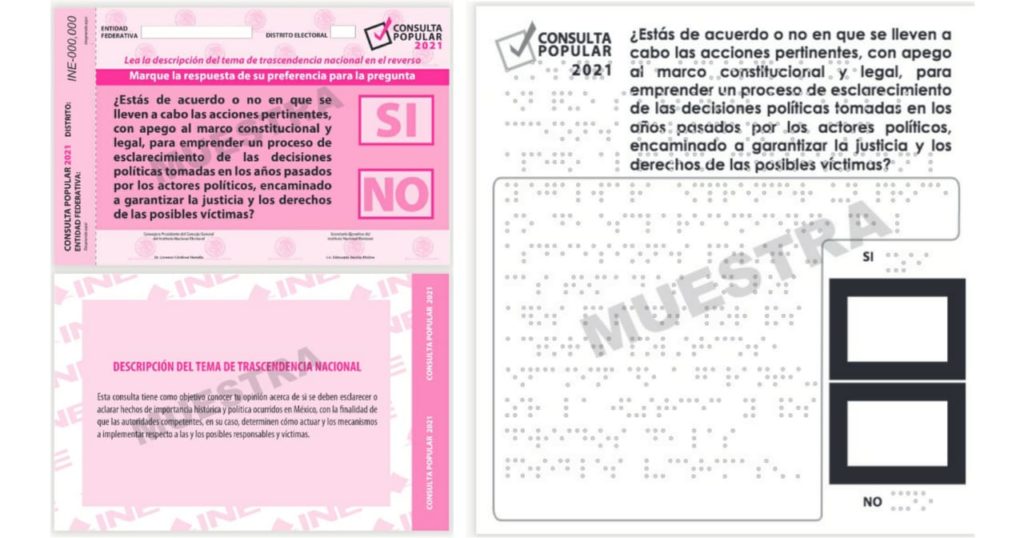 Las papeletas que serán utilizadas durante la consulta, añadió, están impresas en tamaño media carta, en papel bond y en su parte frontal se lee la pregunta objeto de esta herramienta ciudadana, la cual fue avalada por la Suprema Corte de Justicia de la Nación, así como las dos opciones de respuesta que estarán disponibles para que la ciudadanía manifieste su decisión: sí o no.