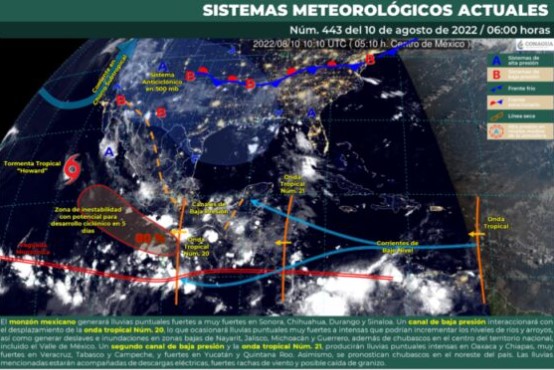 Además, la Onda Tropical traerá lluvias muy fuertes en Campeche y lluvias puntuales muy fuertes a intensas en el sureste de México, todas acompañadas de descargas eléctricas, fuertes rachas de viento y posible caída de granizo, las cuales podrían incrementar los niveles de ríos y arroyos, así como generar deslaves e inundaciones en zonas bajas.
