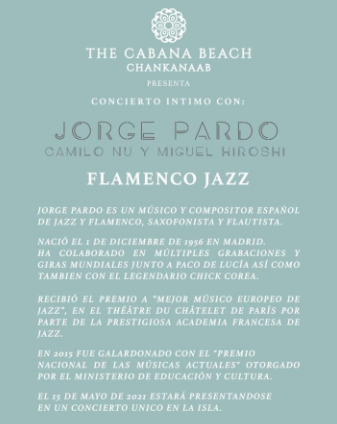 Las reservaciones ya están abiertas en el enlace https://v2.sellmytour.com/booking/thecabanabeach/748?language=es así como en [email protected], en el Whatsapp 987-119-516 y en https://flycozumel.com/jorge-pardo-flamenco-jazz-at-the-cabana-beach/