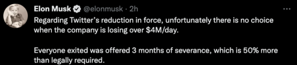 Con respecto a la reducción de la fuerza laboral de Twitter, desafortunadamente no hay otra opción cuando la empresa está perdiendo más de cuatro millones de dólares por día.