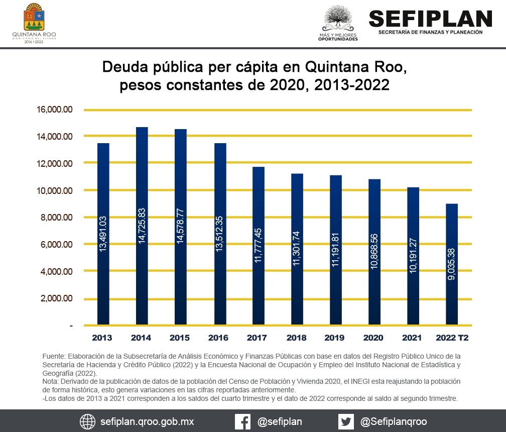 Al respecto, el secretario de Finanzas y Planeación, Ricardo Sánchez Hau mencionó que la Deuda per Cápita se ha reducido de 13 mil 512 pesos por habitante, en 2016, a 9 mil 35 pesos en el segundo trimestre de 2022 considerando pesos constantes de 2020 para excluir los efectos inflacionarios.