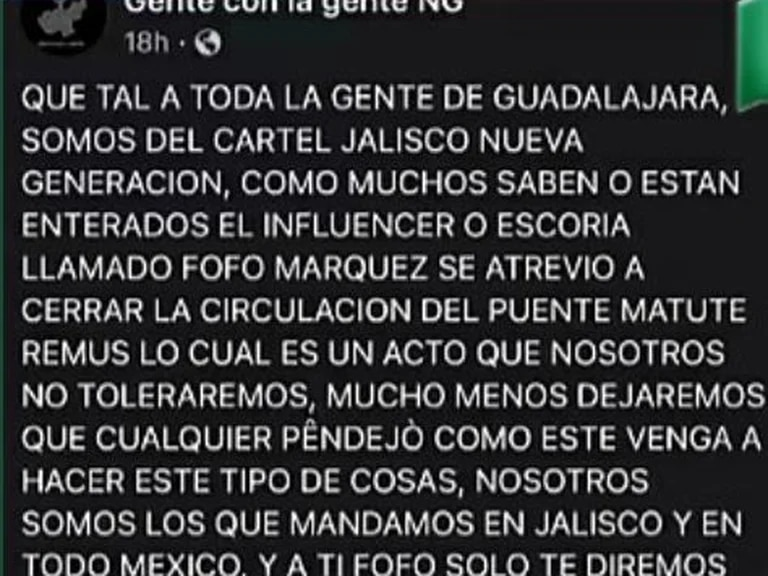 “Qué tal a toda la gente de Guadalajara, somos del CJNG, como muchos saben o están enterados el influencer o escoria llamado Fofo Márquez se atrevió a cerrar la circulación del Puente Matute Remus, lo cual es un acto que nosotros no toleraremos, mucho menos dejaremos que cualquier pendejo como este venga hacer este tipo de cosas. Nosotros somos los que mandamos en Jalisco y todo México”, se refirió en una parte del mensaje.