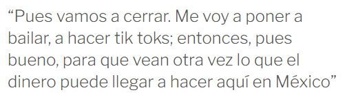 “La gente bien molesta ahí grabándome. señor no me grabe soy figura pública […] Deben de entender que llegó el rey de México. No es prepotencia”, expresó sonriente y orgulloso de sí.