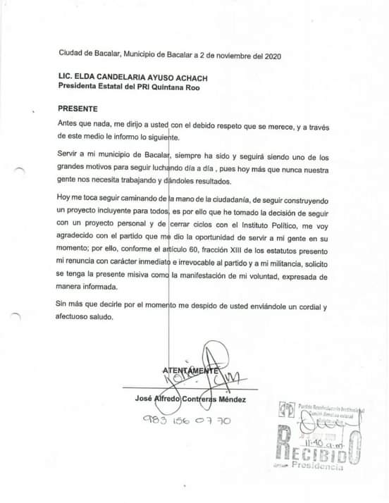 El pasado 02 de noviembre del año 2020 noviembre Contreras Méndez presentó su renuncia ante la presidenta del partido Candelaria Ayuso Borges, en una carta en la que informaba que esa decisión la había tomado para seguir un proyecto personal y de cerrar ciclos con el PRI.