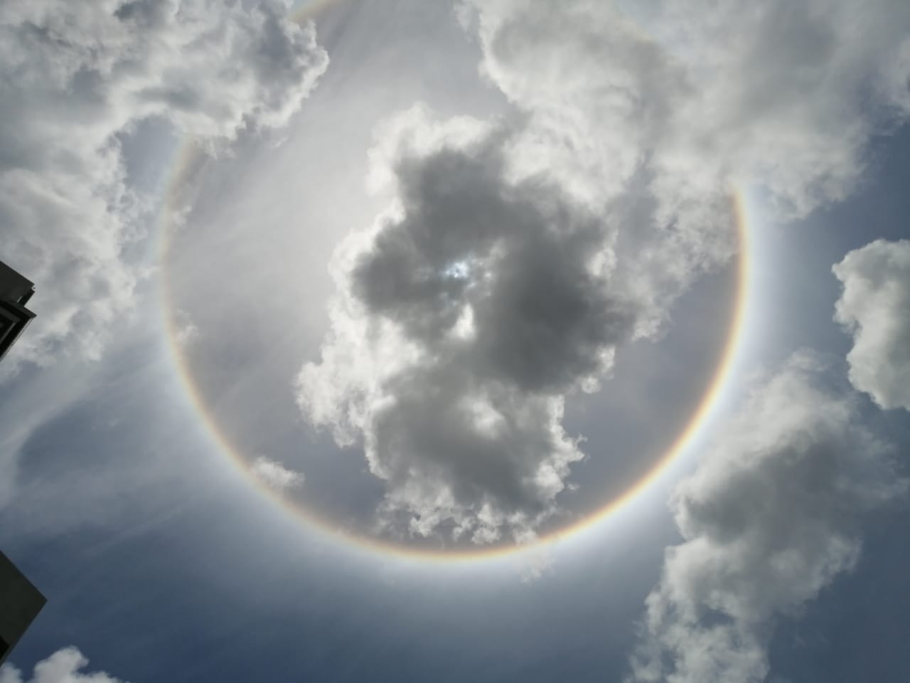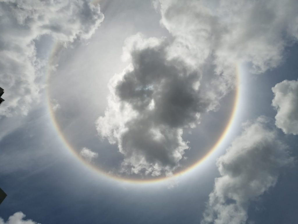 Cancún, Q. Roo, lunes 17 de mayo de 2021, poderycrítica.- Ciudadanos en esta ciudad observan los cielos con sorpresa y admiración, por la formación de un enorme aro solar, visible como un arcoíris circular que rodea al astro rey.