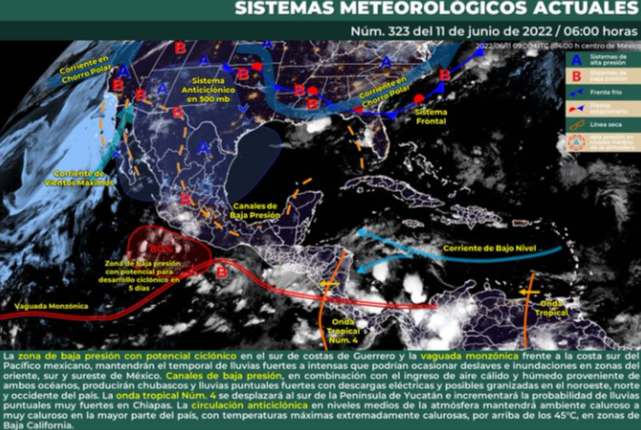 La nueva onda tropical Núm. 4 se desplazará al sur de la Península de Yucatán e incrementará la probabilidad de lluvias puntuales muy fuertes en Chiapas.