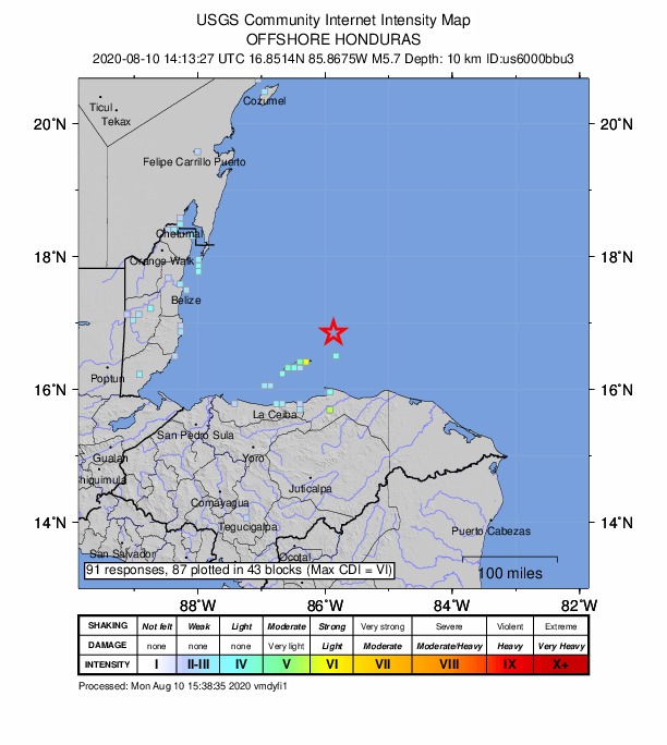 “El sismo de 5.7 grados se registró este lunes a las 9:13 horas frente las costas de Honduras, el cual pudo ser percibido en todo Quintana Roo, según los reportes que se emitieron al número de emergencias 9-1-1. Las vibraciones solo ocasionaron susto a la población, ya que no se tuvo reporte de daños” dijo Martínez Ortega.