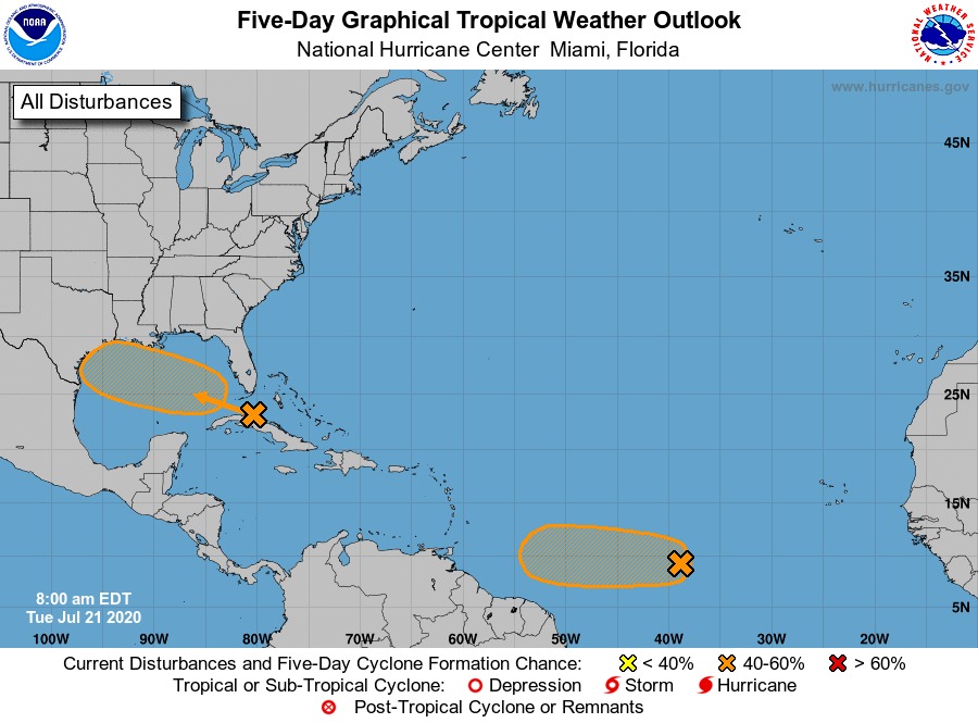Cancún, Q. Roo, Martes 21 de julio de 2020, poderycrítica.- El Servicio Meteorológico Nacional (SMN) mantiene una vigilancia en el océano Atlántico, por dos zonas de baja presión asociadas, la cuales tienen el 40 y el 60 por ciento, de convertirse en Ciclones Tropicales en los próximos cinco días.