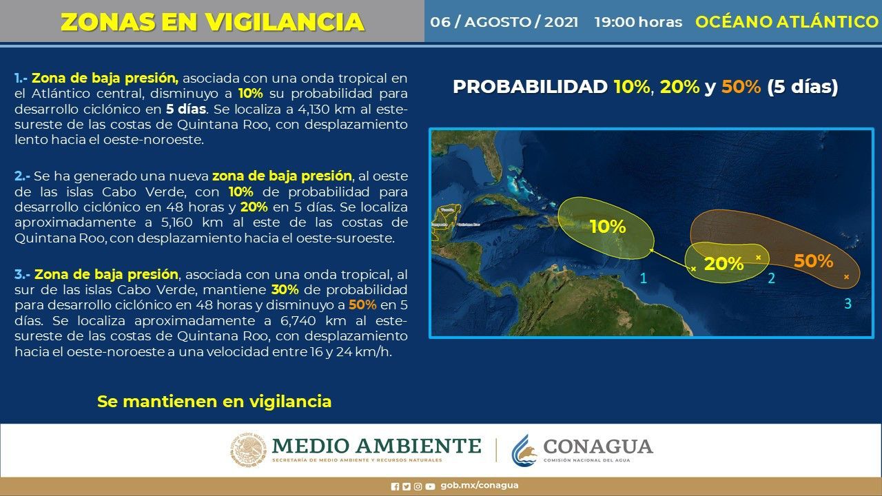 Cancún, Q. Roo, sábado 07 de agosto de 2021, poderycrítica.- Se mantienen en vigilancia 3 zonas de baja presión asociadas con la onda tropical en el Atlántico central disminuyó a 10% su probabilidad para desarrollo ciclónico en 5 días. Se localiza a 4,130 km al este-sureste de las costas de Quintana Roo.