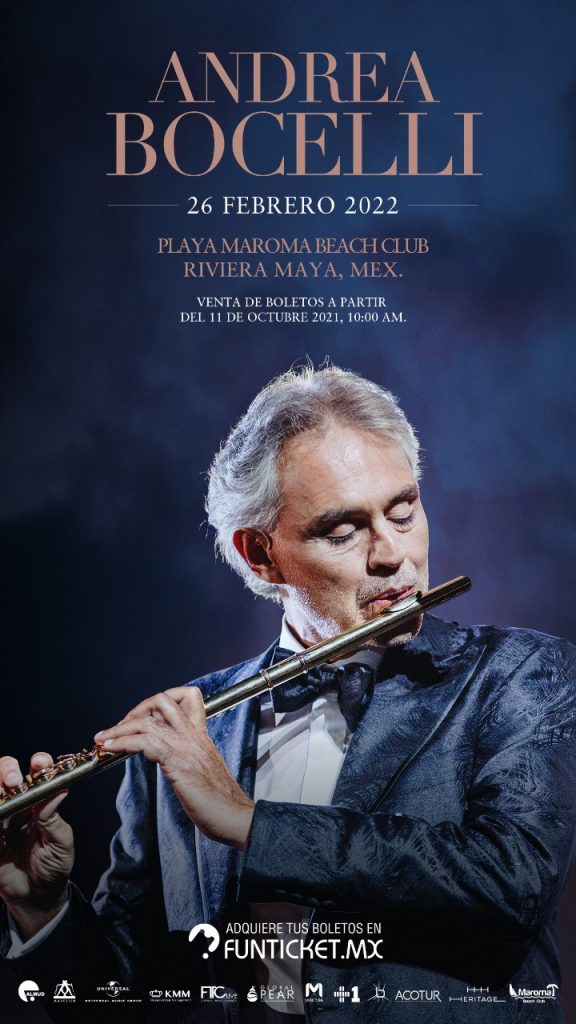 Cancún, Q. Roo, martes 05 de Octubre de 2021, poderycrítica.- Global Pear Live Events y Music Vibe están ansiosos de compartir que Andrea Bocelli se presentará en nuestro país el sábado 26 de Febrero de 2022. Esta velada especial se llevará a cabo en Playa Maroma Beach Club, Riviera Maya, México. La venta de boletos saldrán a la venta a partir del 11 de Octubre, pero con una preventa especial este 7, 8, 9 y 10 de Octubre.