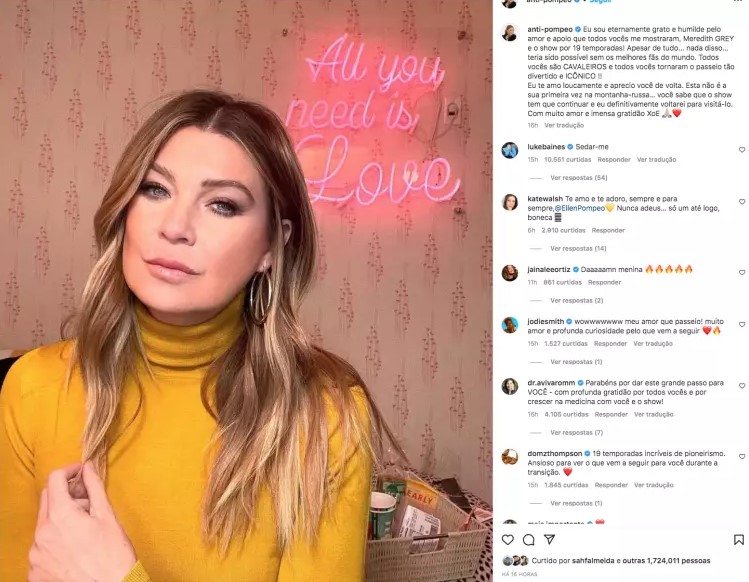 Sin embargo, en el mismo mensaje dio a entender que esto no es el fin de Ellen como actriz y así mismo declaró que ‘Grey’s’ continuara, por lo que no descarta alguna participación especial en un futuro: