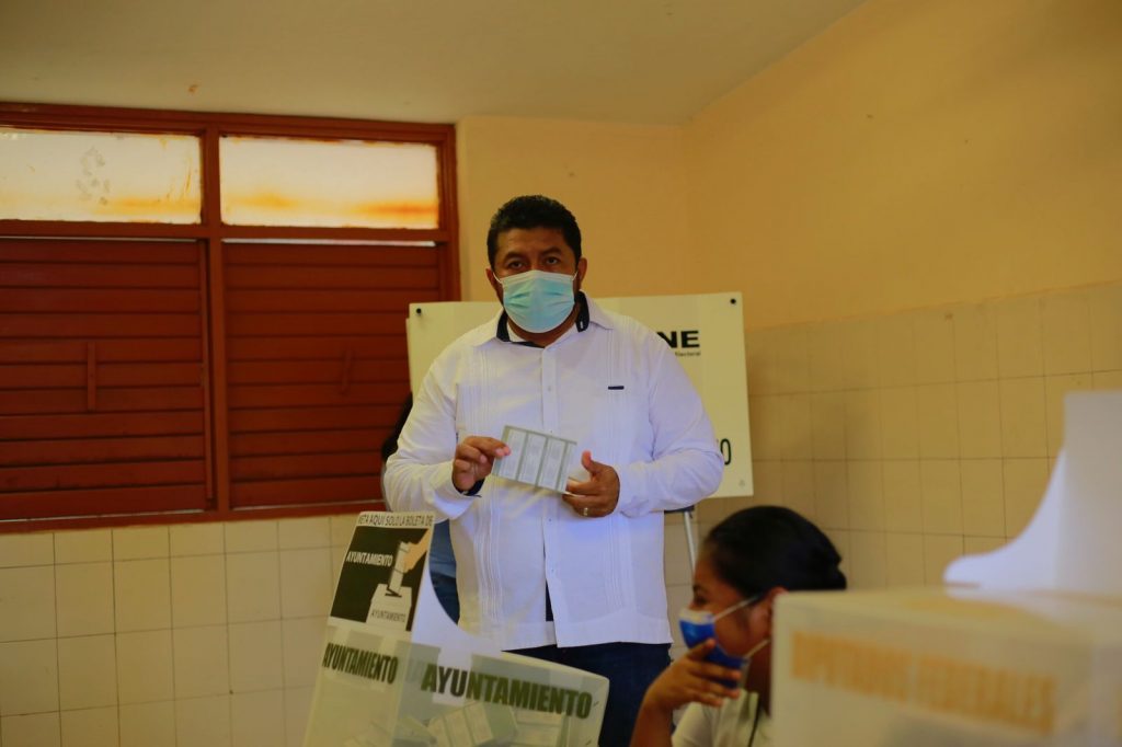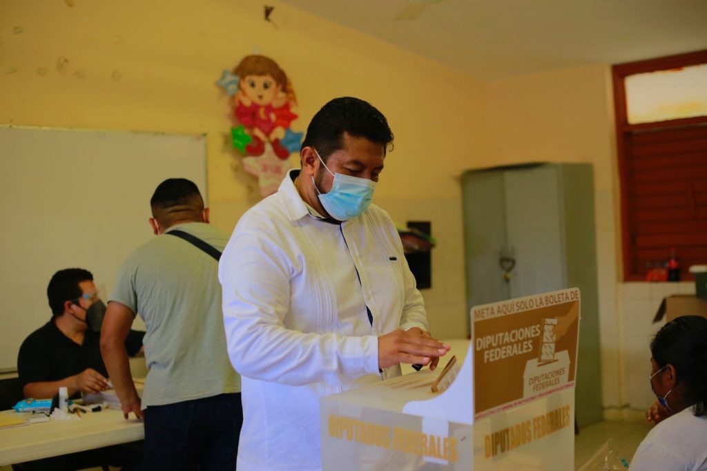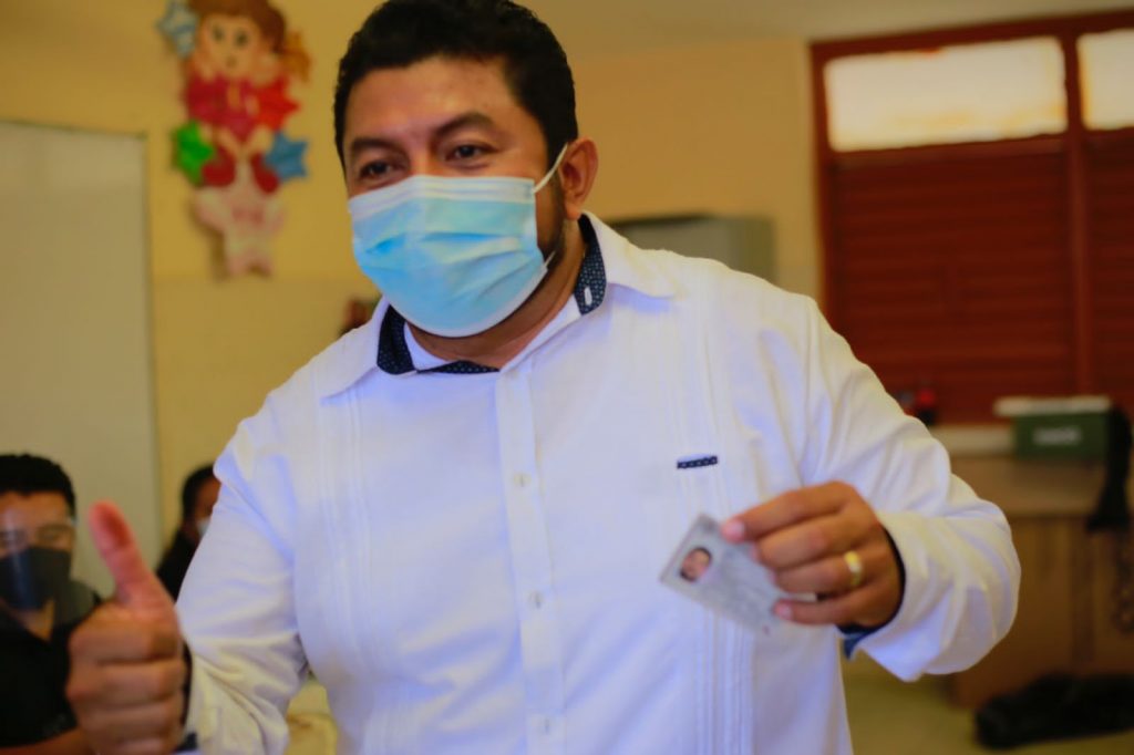 Kantunilkín, Quintana Roo, domingo 06 de junio del 2021, poderycritica.- El candidato de la coalición «Juntos Hacemos Historia» Emir Bellos, emitió su sufragio en la cabecera municipal en la sección 286 en una casilla básica que se colocó en la escuela primaria «Lázaro Cárdenas».