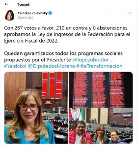 Ciudad de México, Jueves 21 de Octubre de 2021, poderycrítica.- La diputada federal Yeidckol Polevnsky Gurwitz informó en su cuenta que con 267 votos a favor, 210 en contra y 0 abstenciones “aprobamos la Ley de Ingresos de la Federación para el Ejercicio Fiscal de 2022. Quedan garantizados todos los programas sociales propuestos por el Presidente”.