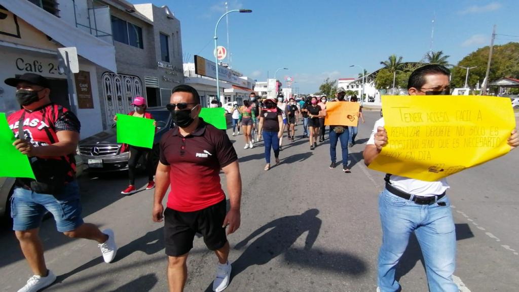 Chetumal, Q. Roo, jueves 18 de febrero de 2021, poderycrítica.- Decenas de atletas, así como entrenadores y dueños de gimnasios se reunieron en el parque la Alameda y marcharon rumbo a las oficinas de la Secretaría de Salud en la Capital del Estado para pedir que se permita la reapertura de los gimnasios durante el semáforo naranja.