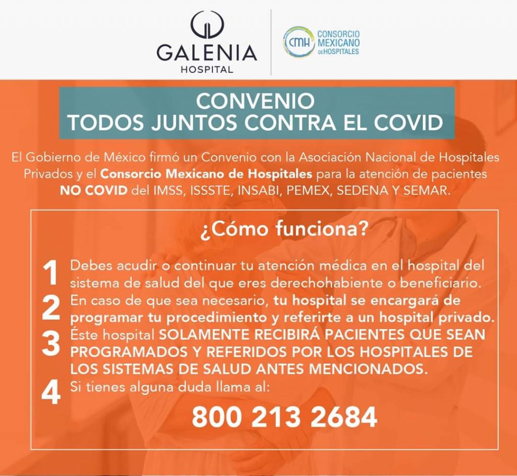 Sin embargo, esta última no reunió las condiciones para participar. Galenia Cancún cuenta con 27 camas y se sumará a los otros 126 nosocomios del país, que a partir del 23 de abril y hasta el 23 de mayo, apoyarán a los centros de salud públicos en la atención de los derechohabientes del Instituto Mexicano del Seguro Social (IMSS), el Instituto de Seguridad y Servicios Sociales de los Trabajadores del Estado (Issste) y del Instituto de Salud para el Bienestar (INSABI).