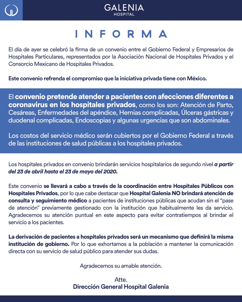 Cancún, Q. Roo, Jueves 23 de Abril de 2020, poderycrítica.- A partir de hoy y hasta el 23 de mayo entra en vigor el acuerdo firmado por la Asociación Nacional de Hospitales Privados con el Gobierno Federal para brindar atención gratuita por casos que no tienen que ver con el Covid 19 a derechohabientes del IMSS, ISSSTE e INSABI.
