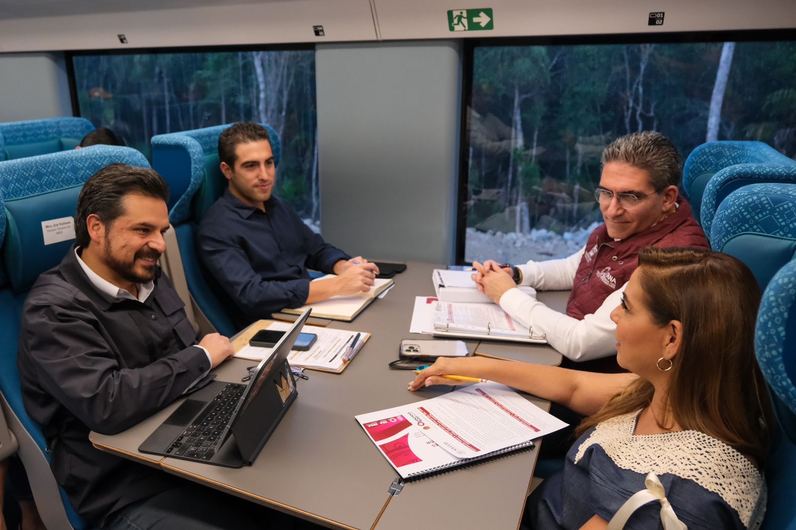 PODER Y CRÍTICA | REDACCIÓN | A bordo del Tren Maya y rumbo a Nuevo Xcán, la gobernadora de Quintana Roo Mara Lezama Espinosa y el director general del Instituto Mexicano del Seguro Social (IMSS), Zoé Robledo, trabajaron en la revisión de los avances de dos nuevos hospitales para el servicio de las personas.