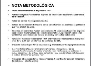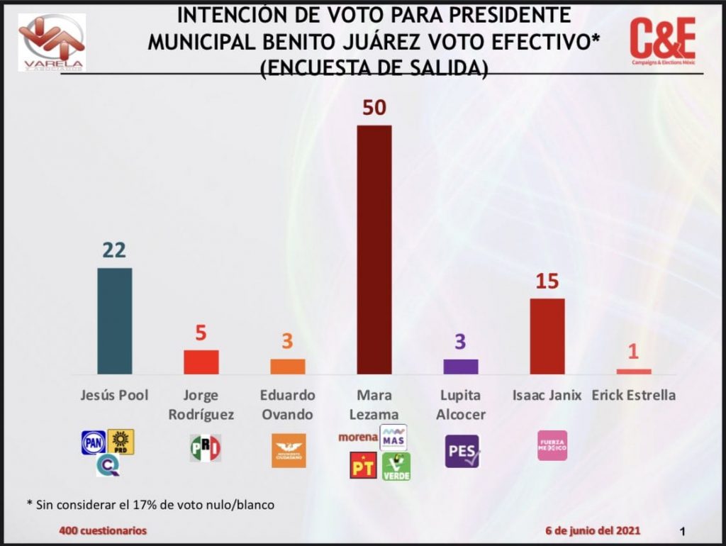 Cancún, Q. Roo, Domingo 06 de Junio de 2021, poderycrítica.- Encuesta de salida por parte de la empresa Campaings&Elections marca contundente triunfo por parte de Mara Lezama por la presidencia municipal de Benito Juárez.