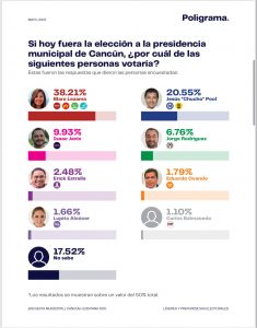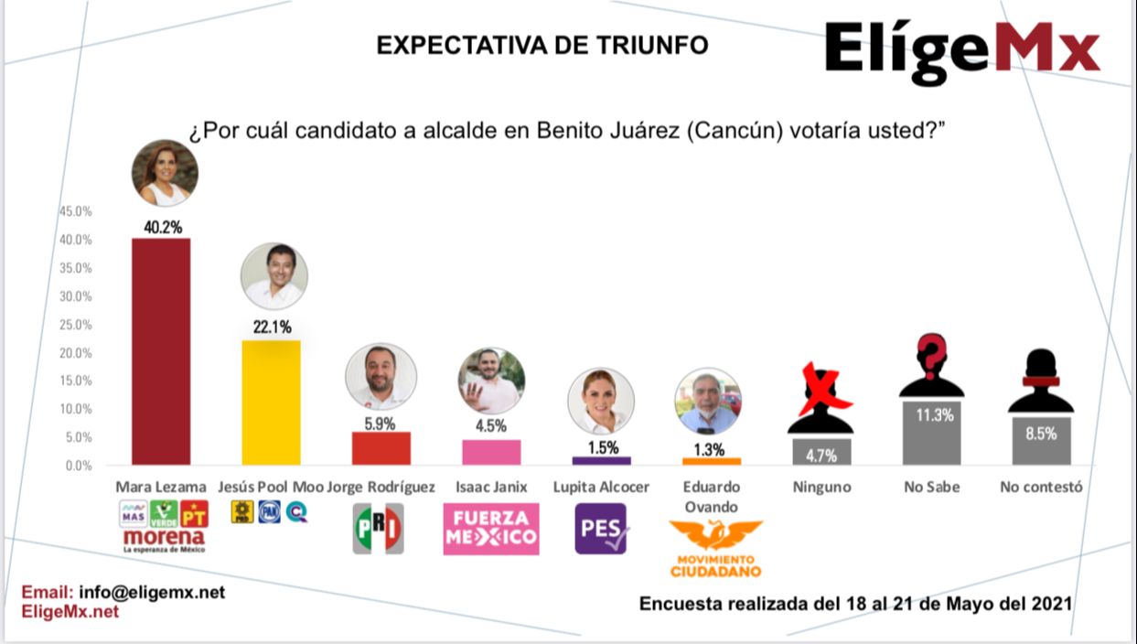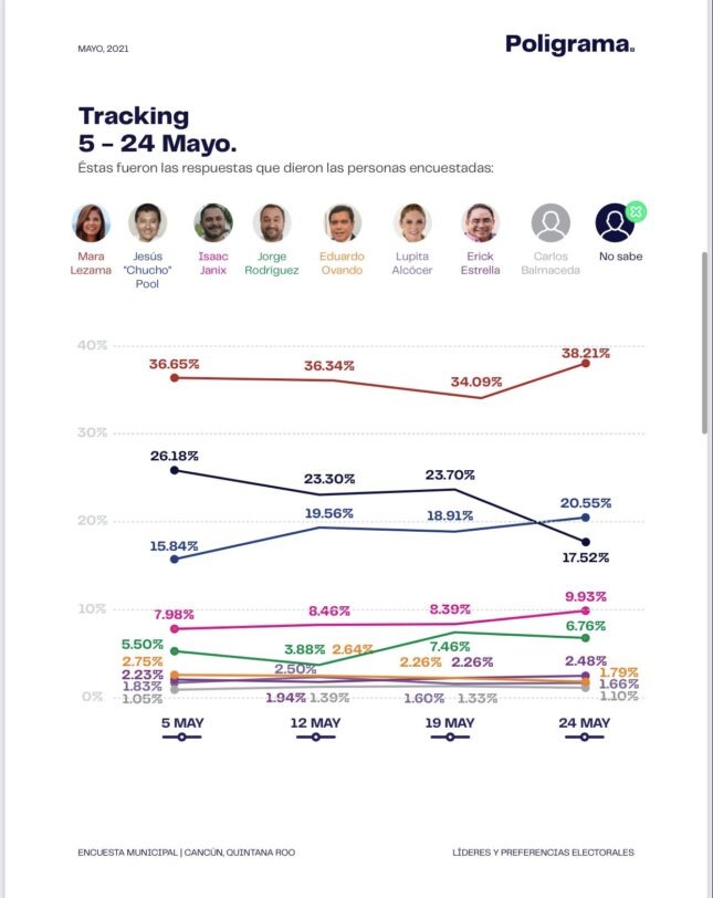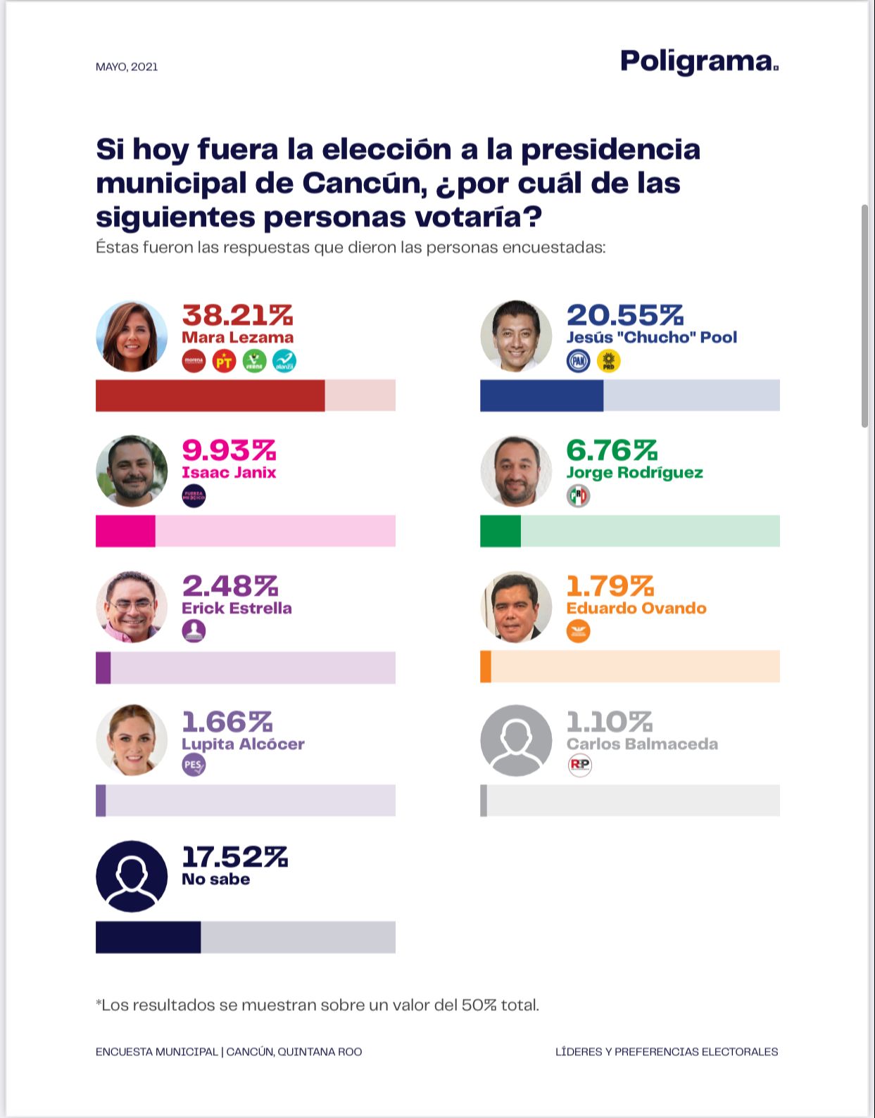 Un estudio efectuado por «Poligrama» pone a Mara Lezama en primer lugar con 38.21 por ciento. Su más inmediato perseguidor es Jesús Pool Moo (Va por Quintana Roo) con 20.55 por ciento.
