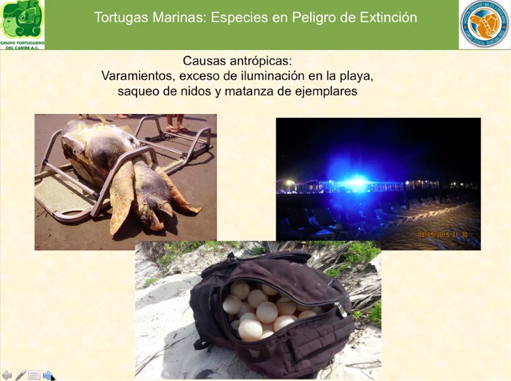 México considera a todas las especies de tortugas marinas en riesgo de extinción. Están amenazadas por redes de pesca, urbanización del litoral, contaminación, turismo masivo, captura objetivo y choques con propelas. Sin embargo -dijo- cada vez más se suman Gobierno, Grupos, Sociedad y Asociaciones para su protección. Maldonado coincidió con el titular del IBANQROO al comentar que, el Santuario de la Tortuga Marina Xcacel-Xcacelito es ejemplo de conservación a nivel peninsular.