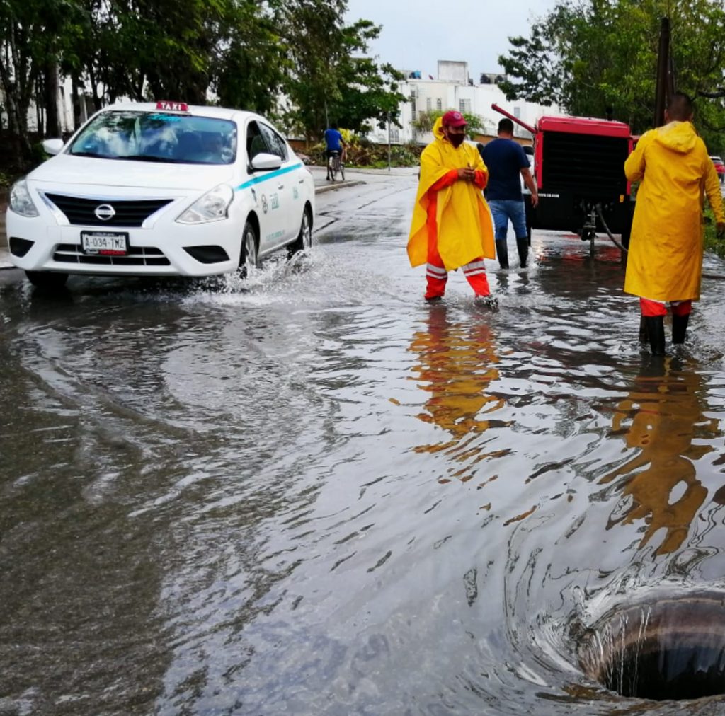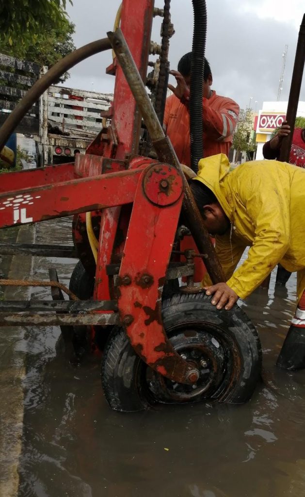 Las brigadas de Servicios Públicos atienden con la maquinaria drill reportes ciudadanos en la franja costera, en las calles 6 y Flamingos, entre CTM y 44. En estos dos puntos se realiza la limpieza de los pozos pluviales hasta los 30 metros de profundidad, aunque los operarios han detectado que en esta zona el manto freático se encuentra saturado por las lluvias y el nivel del mar; por ello, es importante señalar que el agua estancada en este sitio no es proveniente de las aguas negras.