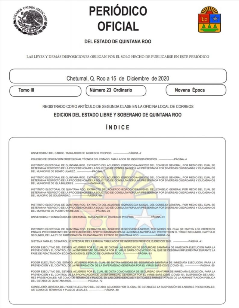 Chetumal, Q. Roo, Jueves 17 de Diciembre de 2020, poderycrítica. – Esta semana entró en vigor la Declaratoria de Seguridad Sanitaria en Quintana Roo anunciada por el gobierno del Estado, ante el rebrote de casos de Covid-19, con la implementación de medias emergentes como la suspensión de actividades presenciales en dependencias y la reactivación de las restricciones de movilidad en los 11 municipios.