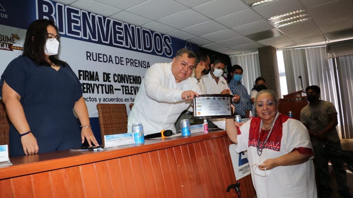 En el marco de la firma de convenio con la Comisión de Radio y Televisión de Tabasco, el director de la Corat, José del Carmen Chablé Ruiz y el presidente de la Canaco-Servytur-Villahermosa, entregaron los reconocimientos.