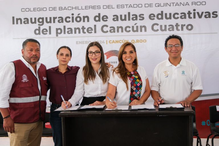 PODER Y CRÍTICA | REDACCIÓN | La gobernadora Mara Lezama Espinosa entregó cinco nuevas aulas a la comunidad escolar del Plantel Cancún 4 del Colegio de Bachilleres que se construyeron con inversión de 9.4 millones de pesos, lo que permitirá atender a aproximadamente 200 estudiantes, adicionales a los 957 que tiene actualmente el plantel, y ampliar en 20% su capacidad física receptiva.