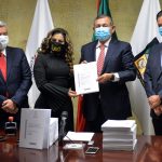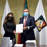 A nombre de la Sexagésima Primera Legislatura del Congreso del Estado, Yumiko Yerania Palomarez Herrera, presidenta de la Mesa Directiva, recibió los documentos que detallan los conceptos de ingresos y egresos en renglones como: Gasto Social, Corriente, Inversión Pública y Desarrollo Económico, Municipios y Órganos Autónomos.