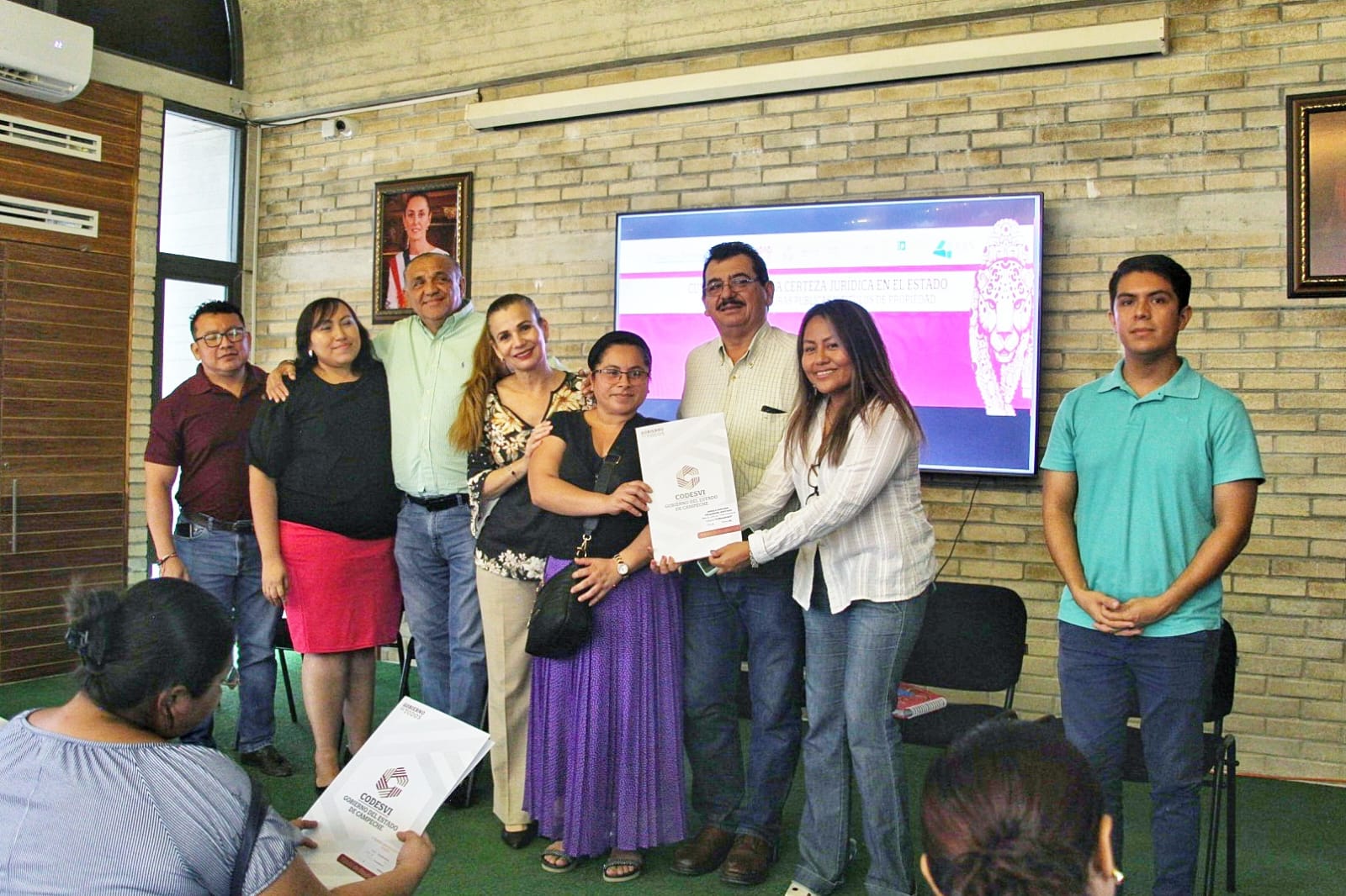 En representación de la titular de la SEGOB, el subsecretario de Gobierno Zona Sur Aureliano Quirarte acompañó al presidente municipal Juan Carlos Hernández Rath durante la ceremonia de entrega de los documentos de propiedad emitidos por la Comisión Estatal de Desarrollo de Suelo y Vivienda (CODESVI).