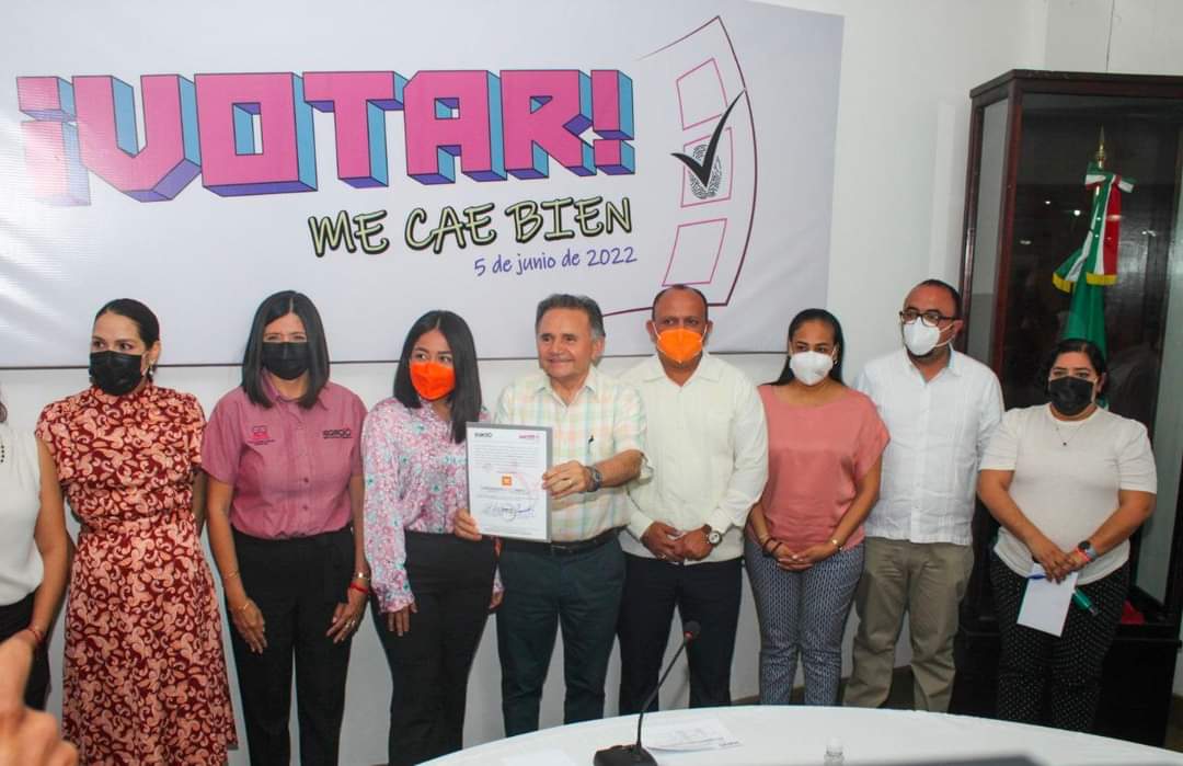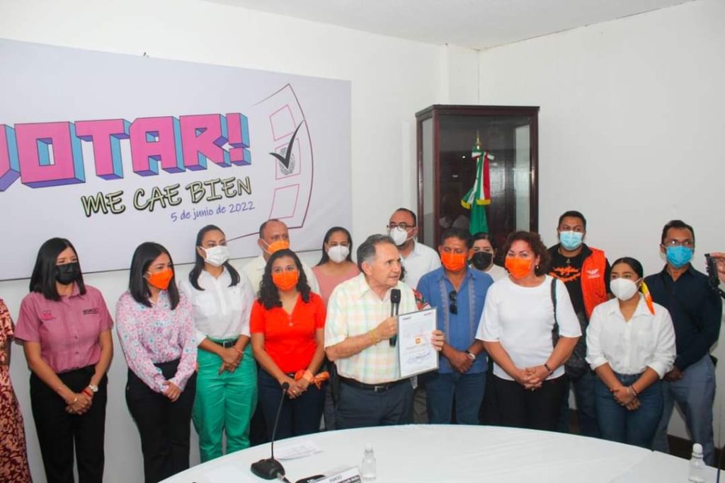 Acompañado por la dirigente estatal del partido, Lidia Fabro, el ex senador de Morena, de manos de la presidenta del Ieqroo, Mayra San Román, recibió el documento.