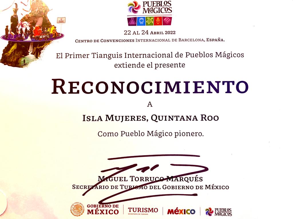PODER Y CRÍTICA | REDACCIÓN | En el marco del Primer Tianguis Internacional de Pueblos Mágicos, la Secretaría de Turismo de México que preside Miguel Torruco Marqués otorgó el reconocimiento de Pueblo Mágico Pionero a la presidenta municipal de Isla Mujeres, Atenea Gómez Ricalde, por su participación en este primer tianguis internacional.