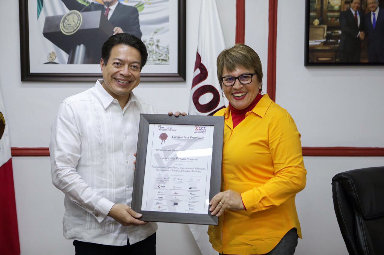 Al recibir de manos de la alcaldesa el Premio Nacional al Buen Gobierno, obtenido por segundo año consecutivo, el líder la felicitó por el reconocimiento y reconoció la firmeza con que el municipio ha sostenido el esquema de mando municipal, sin aceptar el cuestionado Mando Único que ha generado problemas en otros municipios del estado y del país.