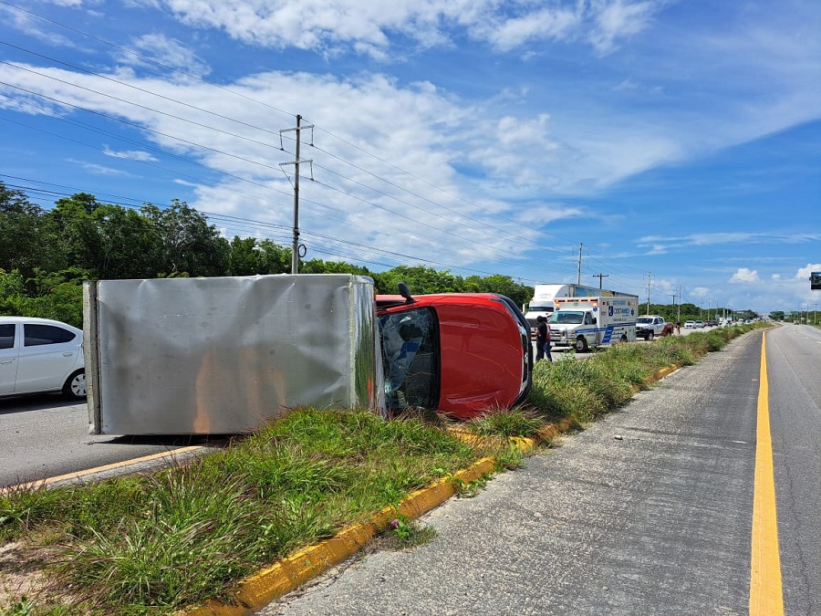 PODER Y CRÍTICA | REDACCIÓN | Una camioneta terminó volcada sobre la carretera federal 307, a la altura del kilómetro 246, en el tramo Tulum-Playa del Carmen, luego de que uno de sus neumáticos estallara esta mañana.