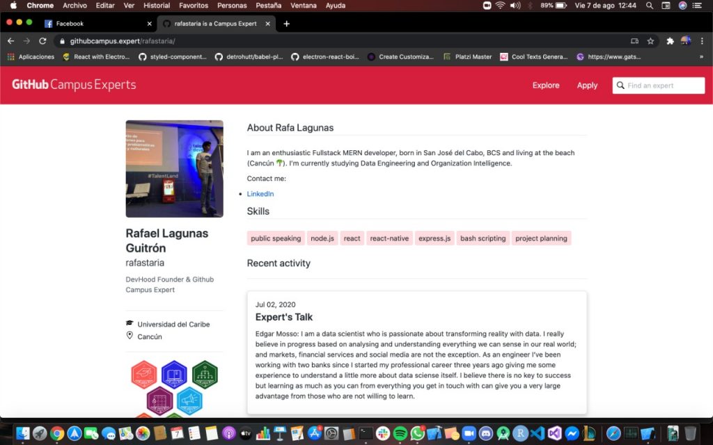 Cabe destacar que sólo existen 277 “GitHub campus experts” en el mundo y Rafael Güitrón Lagunas es el primera del Sureste mexicano:  https://githubcampus.expert/rafastaria/. Lo anterior le permitió evaluar otros proyectos, principalmente de desarrolladores indios, y ofrecer una de las conferencias previas al “HackAgainstCovid”, hackathon internacional que desarrollará del 7 al 9 de agosto: http://hac.codezoned.com/
