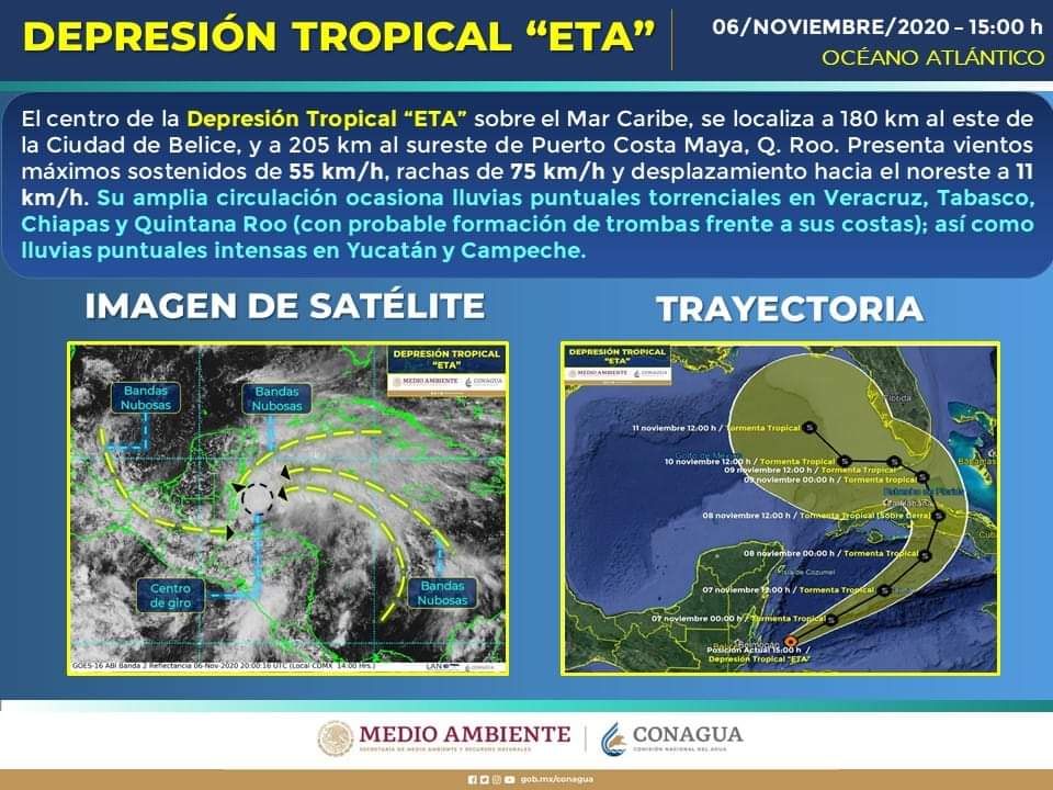 Chetumal, Q. Roo, Viernes 06 de Noviembre del 2020, poderycrítica.- «Eta» continúa como depresión tropical y seguirá generando lluvias en las próximas 24 horas en gran parte del estado, informó la Coordinación Estatal de Protección Civil.