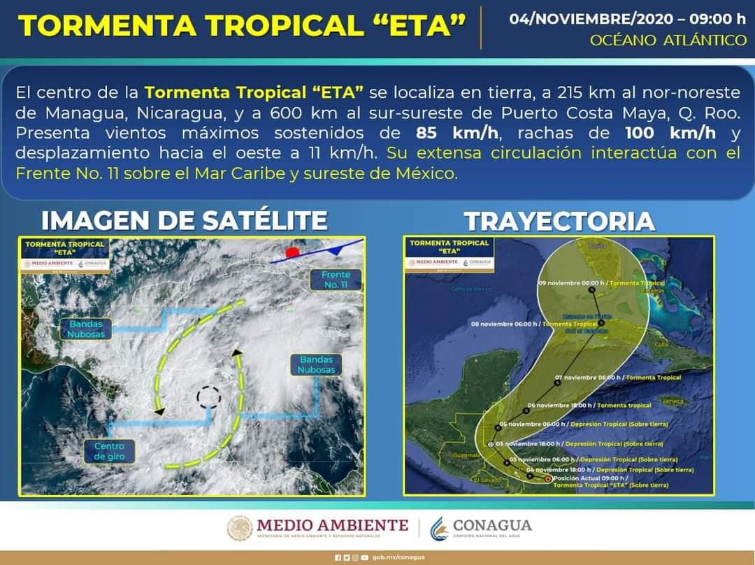 Chetumal, Q. Roo, Miércoles 04 de Noviembre del 2020, poderycritica.- La tormenta tropical Eta se ubica a 600 kilómetros al sur sureste de Puerto Costa Maya. No representa riesgo para la población, señaló la Coordinación Estatal de Protección Civil.