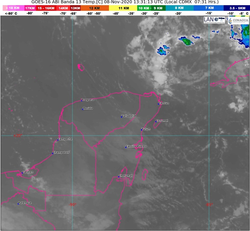 1.- Se mantiene la masa de aire polar continental muy modificada localizada en superficie y ubicada sobre la península de Yucatán, se asocia con la amplia circulación periférica de la tormenta tropical ETA localizada en superficie y ubicada en la porción occidental y al norte del mar Caribe que influencia la entrada de humedad a la porción norte y centro de Quintana Roo; lo que generan, nubosidad variable con algunas nubes de tormenta, con posibilidades lluvias, así como, chubascos, temperaturas frescas a calurosas durante el día, y de calurosas a frescas durante la tarde-noche, viento fresco y arrachado del norte y noreste; en la Península de Yucatán y principalmente en la zona central y norte del estado de Quintana Roo, principalmente después de mediodía.