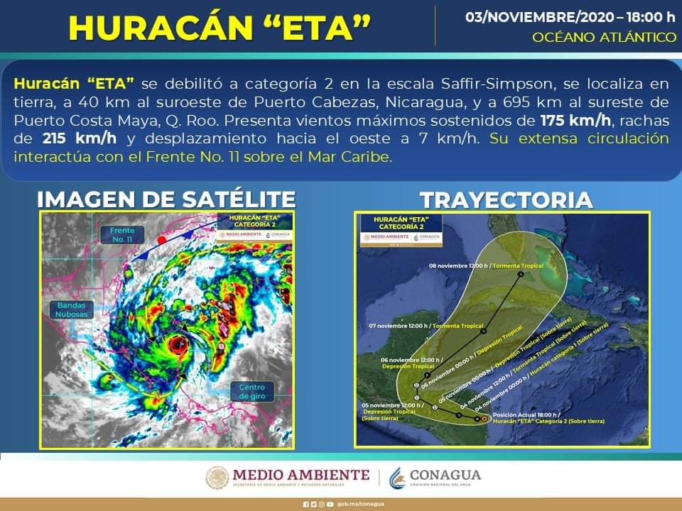 Chetumal, Q. Roo, Martes 03 de Noviembre del 2020, poderycrítica.- El huracán Eta se debilitó esta noche a categoría 2 en la escala Saffir Simpson.
