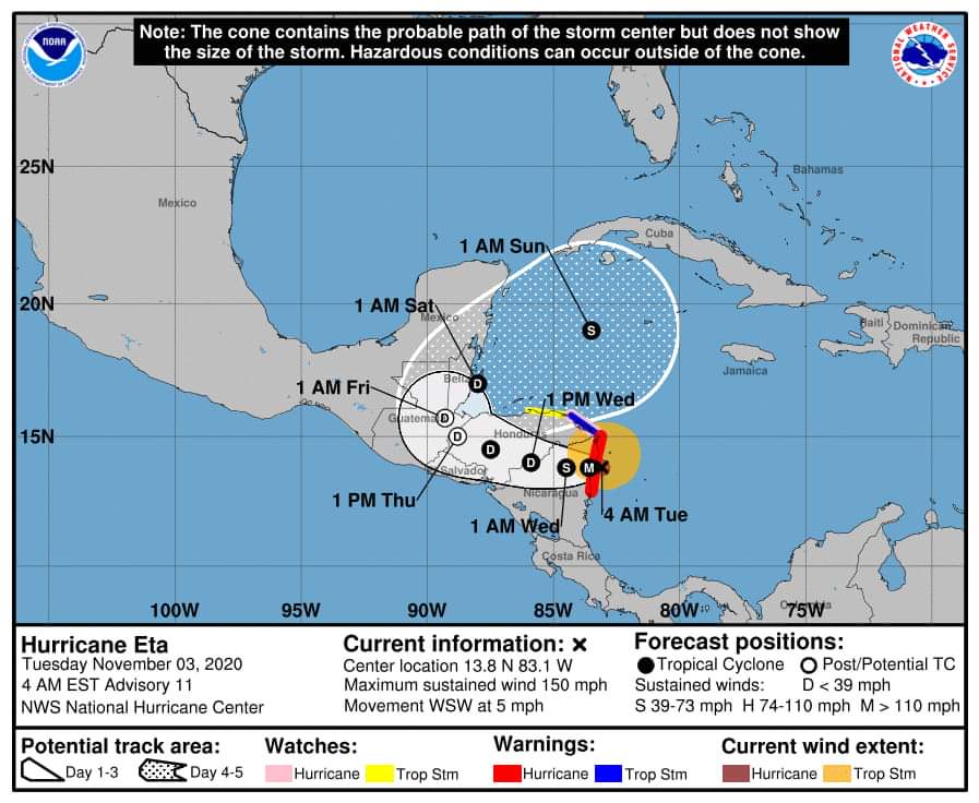 El centro del huracán Eta categoría 4 en la escala Saffir-Simpson, se localizaba aproximadamente a las 7:00 horas de este martes 3 de noviembre, a 19 kilómetros al sureste de Puerto Cabezas, Nicaragua, y a 714 km al sureste de Puerto Costa, Quintana Roo. Presenta vientos máximos sostenidos a 240 km/h, rachas de 295 km/h y desplazamiento hacia el Oeste suroeste a 7 km/h.