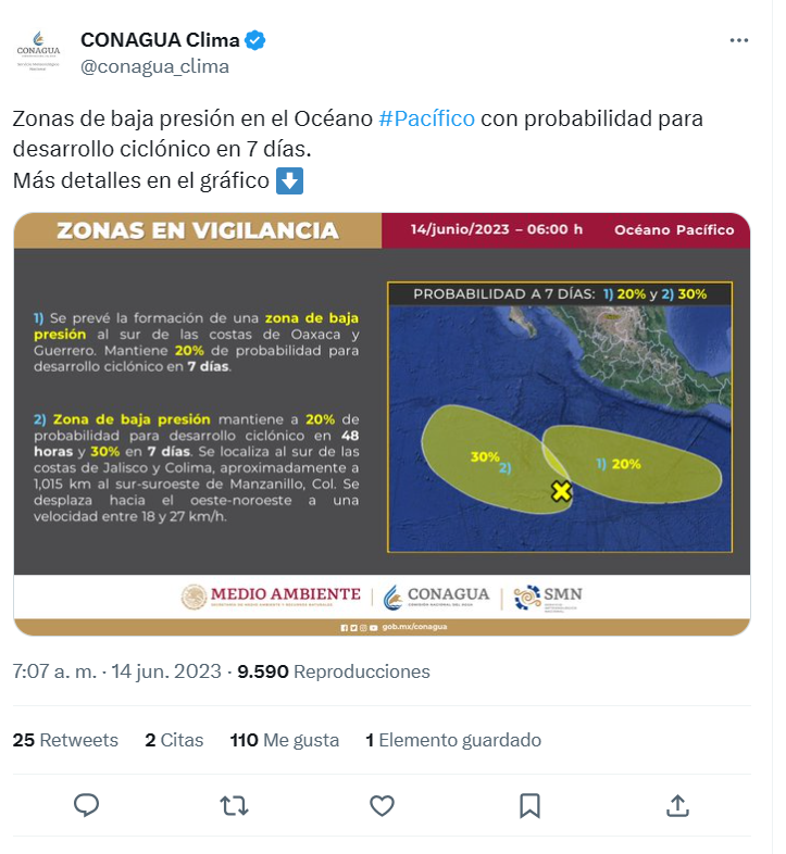 Poder y Crítica | Redacción | Desde inicios de semana, el Servicio Meteorológico Nacional de la Conagua y el Centro Nacional de Huracanes (NHC) comenzaron a vigila la primera zona de inestabilidad en aguas del Pacífico mexicano, a casi mil km al sur de las costas de Michoacán y Jalisco, debido a que los modelos numéricos resuelven una posible formación ciclónica a finales de esta semana.