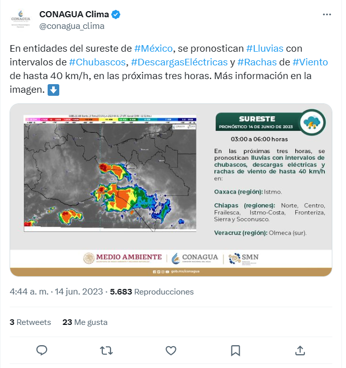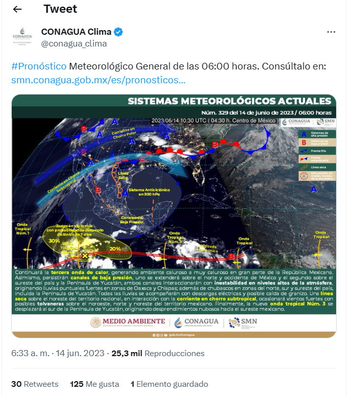 Para este miércoles, continuará la tercera onda de calor, generando ambiente caluroso a muy caluroso en gran parte de la República Mexicana. Asimismo, persistirán canales de baja presión, uno se extenderá sobre el norte y occidente de México y el segundo sobre el sureste del país y la Península de Yucatán, ambos canales interaccionarán con inestabilidad en niveles altos de la atmósfera, originando lluvias puntuales fuertes en zonas de Oaxaca y Chiapas; además de chubascos en zonas del norte, sur y sureste del país, incluida la Península de Yucatán. Todas las lluvias se acompañarán con descargas eléctricas y posible caída de granizo.